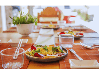 La colazione viene servita nella zona pranzo, nella suite o, nei mesi estivi, nel giardino o nella terrazza della suite.