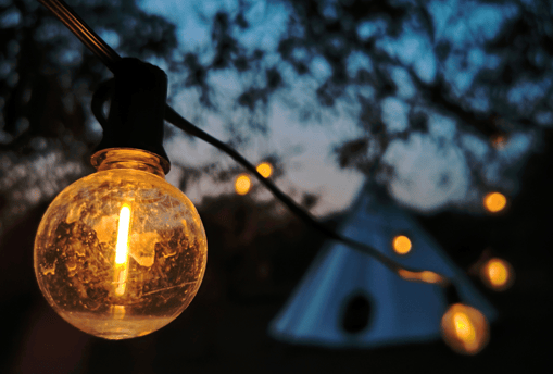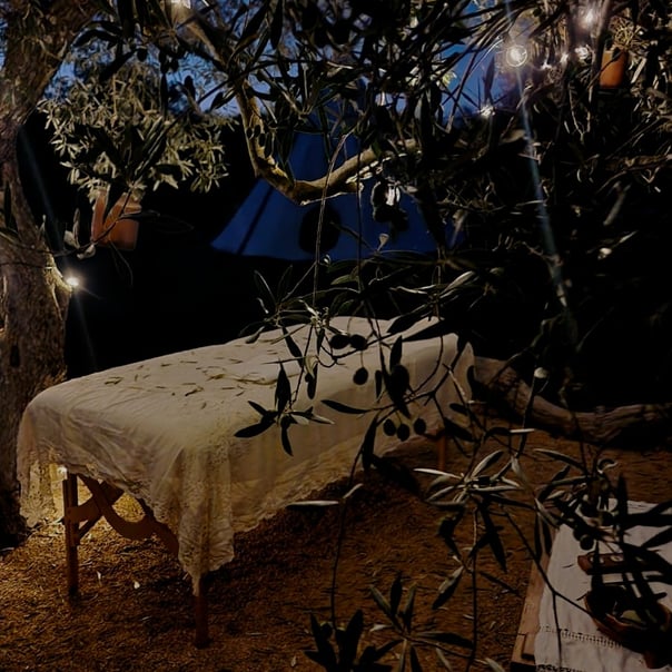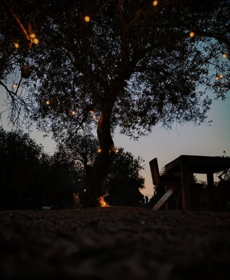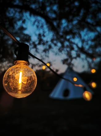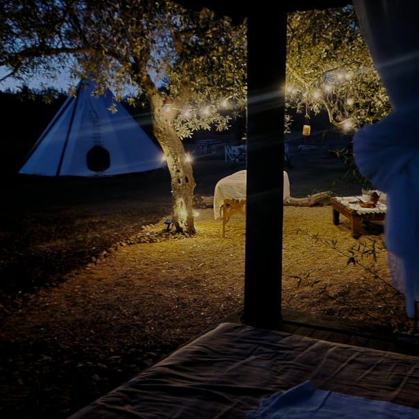 Di notte, il bagliore del fuoco danza e il tepee si illumina di magia